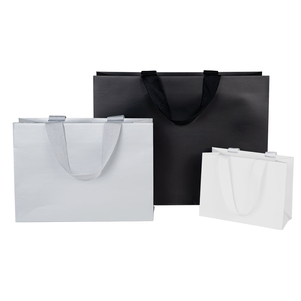 Luxury Gift Bags: Embossed Laminated Material, Thick Woven Handles, Arrow Fold Removable Bottom Board, Printed on the inside, Made in China