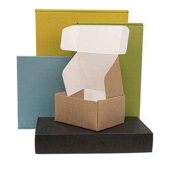 E-Commerce boxes come in different sizes. The boxes are reversible with designated colour and kraft. The punch color can be on the inside or outside! These boxes are great for online sellers they mail perfectly and present product with a splash of colour inside or out with the boxes reversibility. No tape is required for assembly.